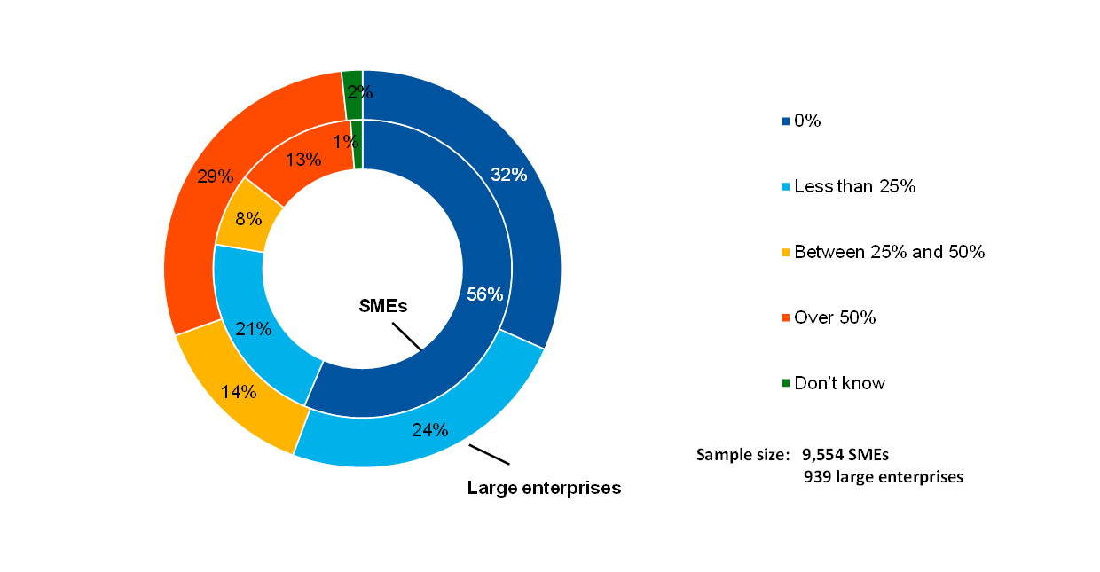 The survey collected some information on the exporting activities of euro area enterprises for the third time. The overall picture of euro area SME exports arising from this survey round reaffirms the crucial role of non-domestic sales for euro area companies. Of the SMEs that participated in the survey, 42% reported that they had exported some goods or services, with the percentage of exporting enterprises increasing with size and reaching 67% among large companies.