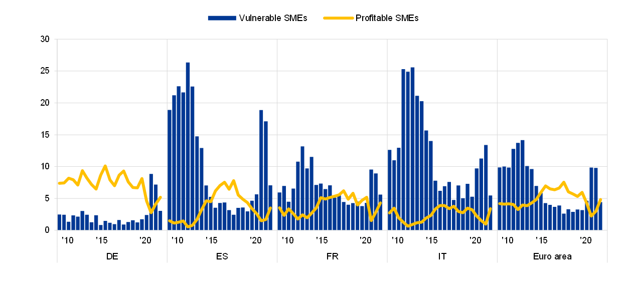 The profitability and vulnerability indicators for SMEs showed improvements across all the largest euro area economies (see Chart 6 for the euro area and the four largest countries). Nevertheless, the percentage of vulnerable companies remains somewhat higher in Spain (7.1%, but down from 17.1%), Italy (5.5%, down from 13.4%) and France (5.6%, down from 8.9%), compared with Germany (3%, down from 7.2%) and the euro area as whole (4.4%, down from 9.8%). Profitability also improved, ranging between 3.4% and 5.2% of firms across the four largest economies in this survey round. For details of trends in other euro area countries, see Chart 35 in Annex 1.