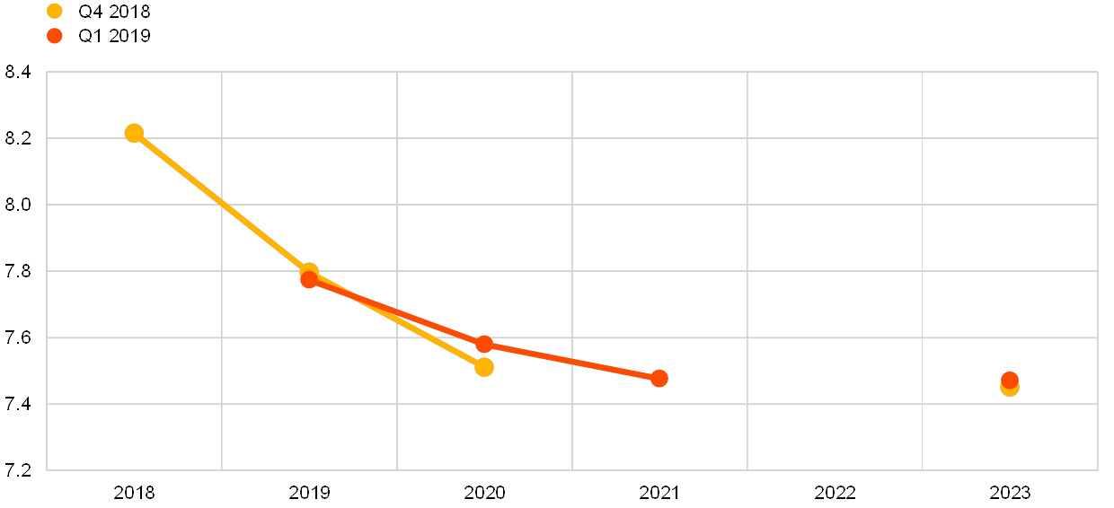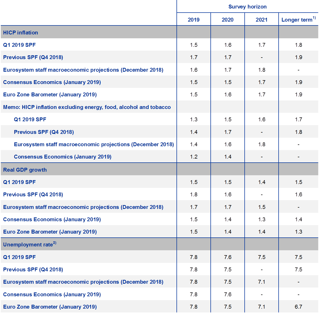 The results of the ECB Survey of Professional Forecasters (SPF) for the first quarter of 2019 show downward revisions to inflation and real GDP growth expectations, particularly in the near term[1]. HICP inflation expectations stood at 1.5%, 1.6% and 1.7% for 2019, 2020 and 2021, respectively. Longer-term inflation expectations were also revised down, to 1.8% from 1.9%. Expectations for real GDP growth stood at 1.5%, 1.5%, and 1.4% for 2019, 2020 and 2021, respectively. Expectations for real GDP growth in the longer term were also revised down, to 1.5%. Unemployment rate expectations were broadly unchanged and continued to point to further falls towards a longer-term unemployment rate of 7.5%.