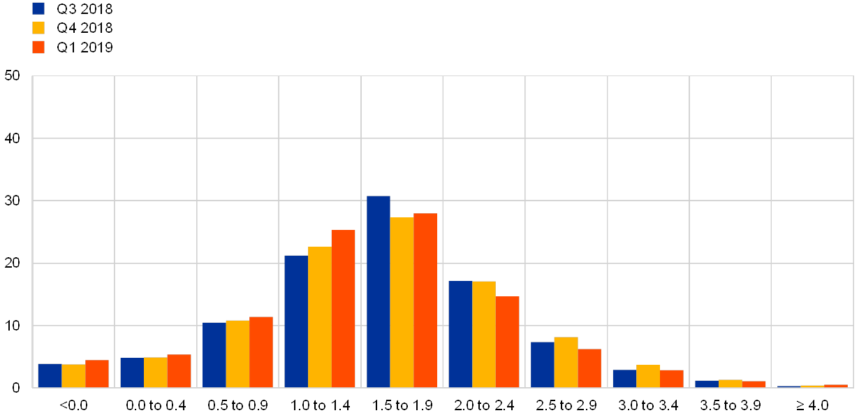 Average expectations for inflation excluding energy, food, alcohol and tobacco (HICPX) were revised down to stand at 1.3%, 1.5% and 1.6% for 2019, 2020 and 2021, respectively. The latest SPF profile represents downward revisions of 0.1p.p. for 2019 and 0.2p.p. for 2020. However, when calculated using the unrounded results, the downward revision for 2020 was a little smaller than that for 2019 (see Chart 1).