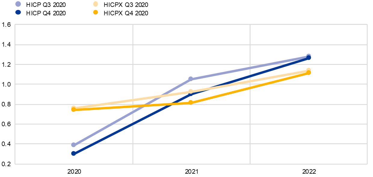 2. In addition to calendar year forecasts (current calendar year, next calendar year, year after next and four/five years ahead), SPF panellists are also asked for their one and two-year ahead (of the latest available data) rolling horizon forecasts. In the fourth-quarter round, these were for September 2021 and September 2022 (in the third-quarter round they were for June 2021 and June 2022). The fact that the current and next calendar year forecasts were revised down while the rolling horizon forecasts were not, suggests that the downward revisions in the calendar year forecasts stem from actual inflation outcomes for July, August and September 2020.