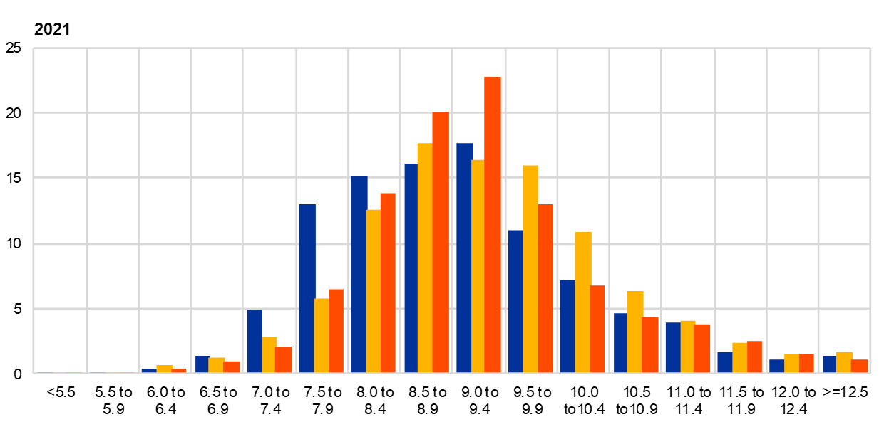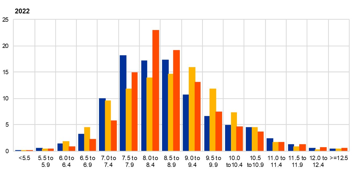 (x-axis: longer-term HICP inflation expectations, annual percentage changes; y-axis: percentages of respondents)